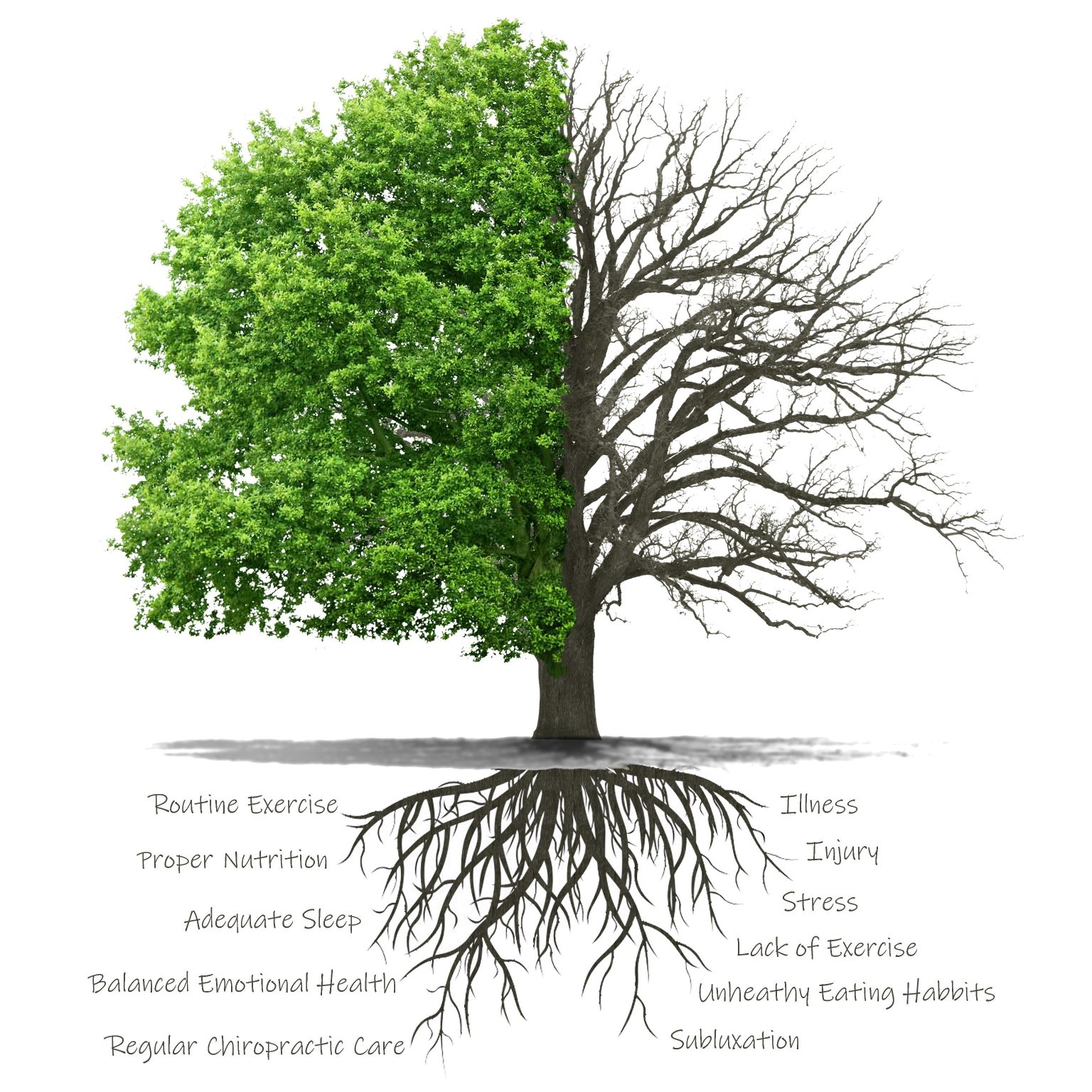 Living Tree Chiropractic, LLC is a name derived from the comparison of the overall health of a tree and the overall health of a person. Like a tree, where the visible health of the tree above ground is a direct result of the nutrients and ground conditions the underlying roots are exposed to, the overall health of an individual person is a direct result of his or her underlying mental and physical wellness and what he or she exposes their body to.